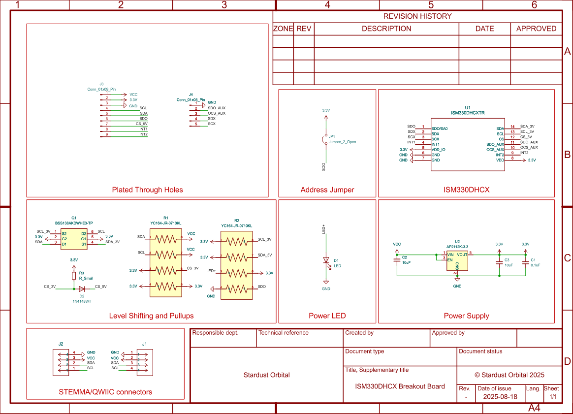 The board supports both I²C and SPI communication, includes two configurable interrupt pins, and can act as a sensor hub via its secondary I²C/SPI interfaces. This board includes two 4-pin JST connectors compatible with Qwiic/STEMMA QT. Onboard power regulator and level-shifting ensure compatibility with both 3.3 V and 5 V systems.